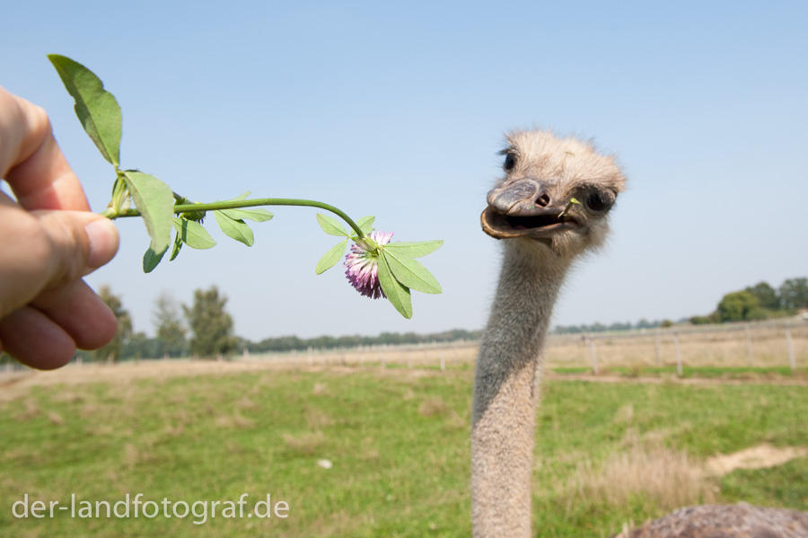 Ich habe es den Straußen einfacher gemacht und ihnen frischen Klee vor ihren beeindruckenden Schnabel gehalten. Apropos Schnabel, Strauße picken alles an was sie interessiert, und sie interessieren sich für alles, also auch für Fotografen und deren Ausrüstung. Da der besagte Schnabel groß und kräftig ist, tut so ein Picken durchaus weh und kann schon mal blaue Flecken hinterlassen.