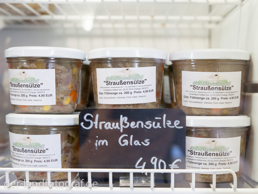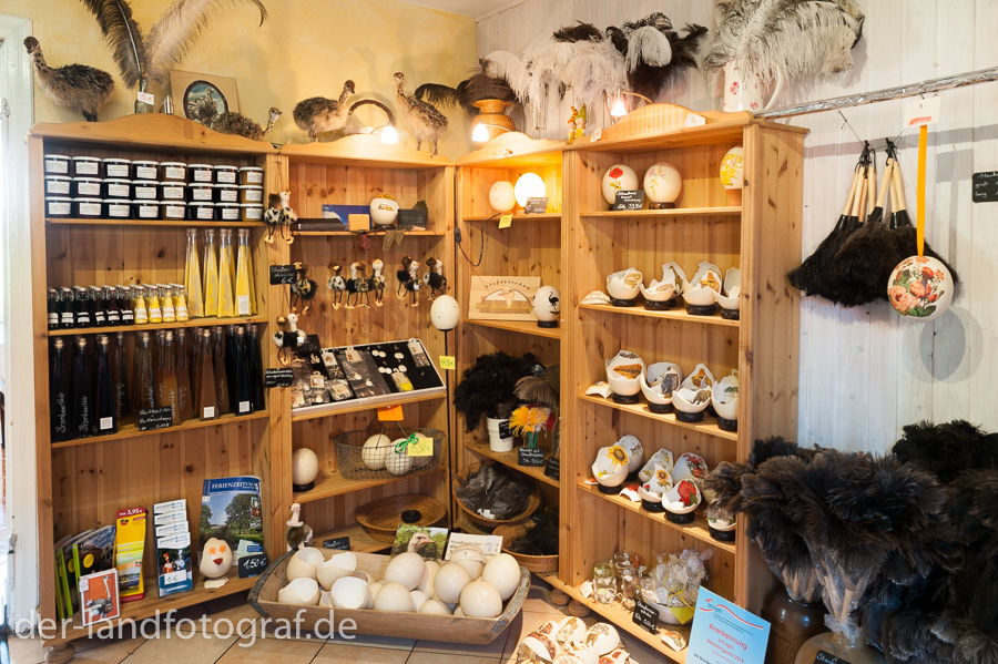 - Im Hofladen kann man, neben Fleisch und Wurstwaren auch verzierte Straußeneier und Straußenfedern kaufen.
